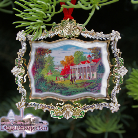 The back of the ornament includes a quote from one of their famous guests, Eliza Powel from her 1787 visit, to Martha Washington that reads, "The elegant Hospitality exercised at Mount Vernon... renders it a most delightful Residence to your Friends."