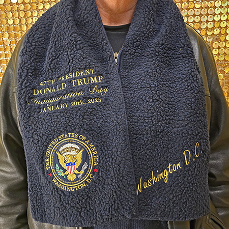 Commemorate Donald Trump's historic inauguration as the 47th President of the United States with this luxurious black fleece scarf. Featuring intricate gold embroidery, it proudly displays "Donald Trump, 47th President, Inauguration Day, January 20th, 2025," alongside the official Presidential Seal and "Washington D.C." inscription. Crafted from ultra-soft, premium fleece, this scarf offers unmatched comfort and warmth, making it both a practical winter accessory and a meaningful piece of memorabilia. Perfect for supporters, collectors, or as a unique gift, this scarf captures the essence of a monumental event in American history. Whether you're braving the cold or showcasing your pride, this scarf is a stylish and timeless addition to your collection!