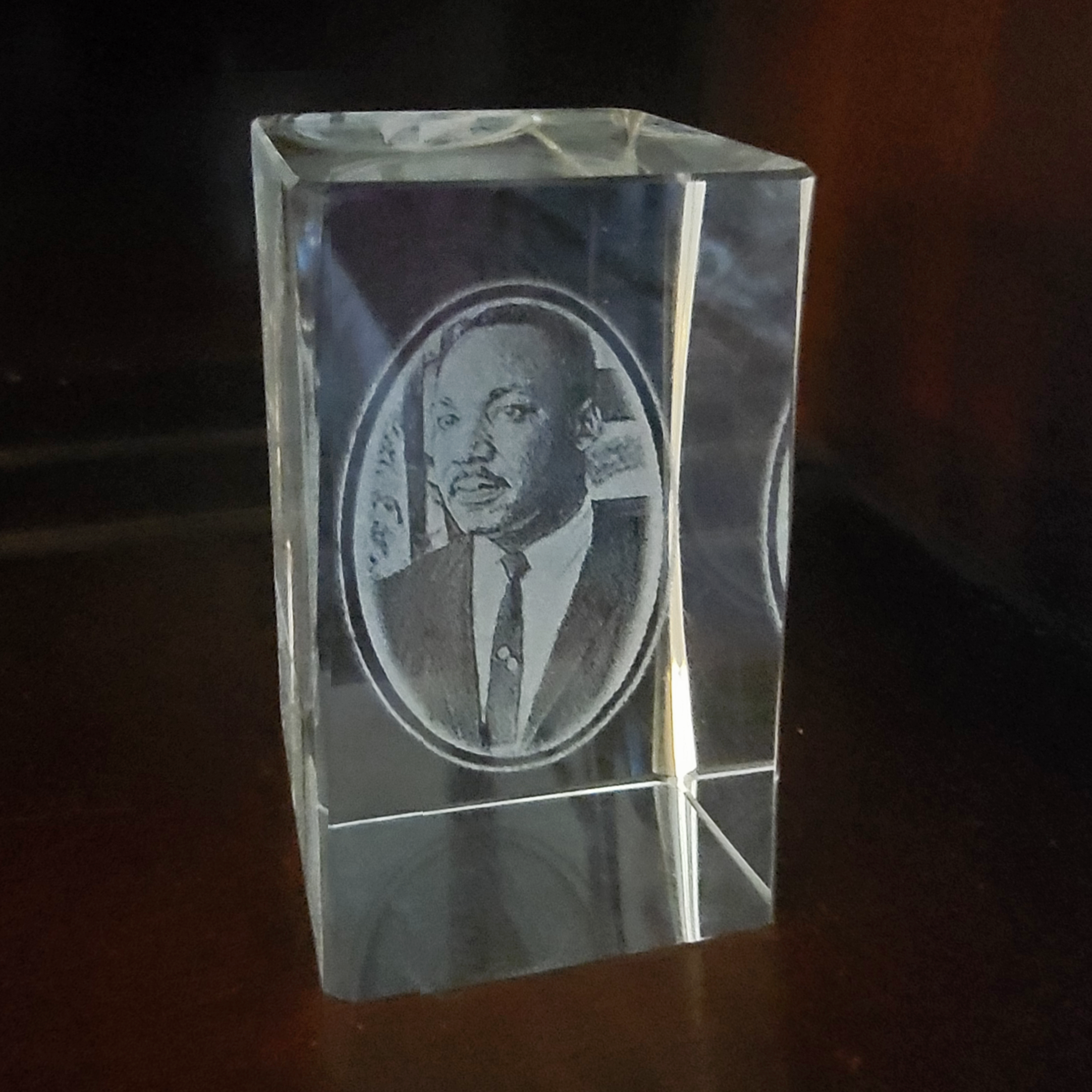 This Martin Luther King Laser Crystal Paperweight is a beautiful and meaningful addition to any office or home. Made from high-quality crystal, this paperweight features a stunning three-dimensional laser etched image of Martin Luther King. The design is viewable from any angle, making it a perfect display piece for any desk or shelf.